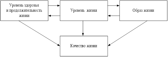 Обобщая вышесказанное, качество жизни можно трактовать как интегральную категорию, всесторонне характеризующую уровень и степень благосостояния свободы, социального и духовного развития человека, а также его физическое здоровье. В числе её структурных составляющих можно выделить (в значительной мере условно, ибо между ними прослеживаются определённые взаимосвязи) следующие основные компоненты: уровень здоровья и продолжительность жизни населения, уровень жизни населения, образ жизни населения (рис. 1).