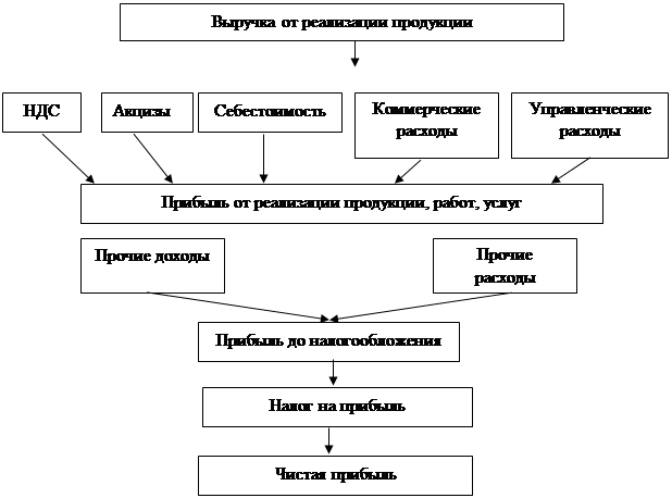 Для формирования прибыли важное значение имеет определение момента реализации продукции. В отдельных законодательных актах по - разному трактуется момент реализации. Однако независимо от принятой трактовки момента реализации в законодательных актах, формирование на предприятии прибыли от реализации продукции имеет место только при условии реальной реализации, то есть при зачислении средств от покупателя на расчетный счет поставщика. Определение момента реализации по дате отгрузки товаров и связанное при этом возникновение налоговых обязательств сопровождается отвлечением оборотных средствпредприятий на уплату налогов, ухудшением их финансового состояния. Формирование прибыли выглядит таким образом (рисунок 1).