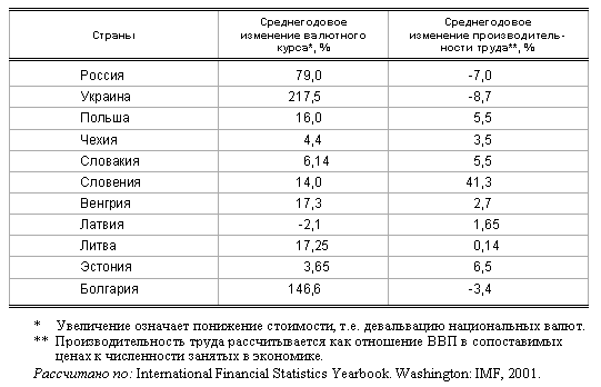 Как следует из приведенных данных, в 1990-х годах наибольшие показатели девальвации валюты (до 217% в год) наблюдались в странах, где темпы роста производительности труда были отрицательными. В России, где производительность труда уменьшалась в среднем за рассматриваемый период на 7% в год, ежегодная девальвация рубля составила в среднем 79%.