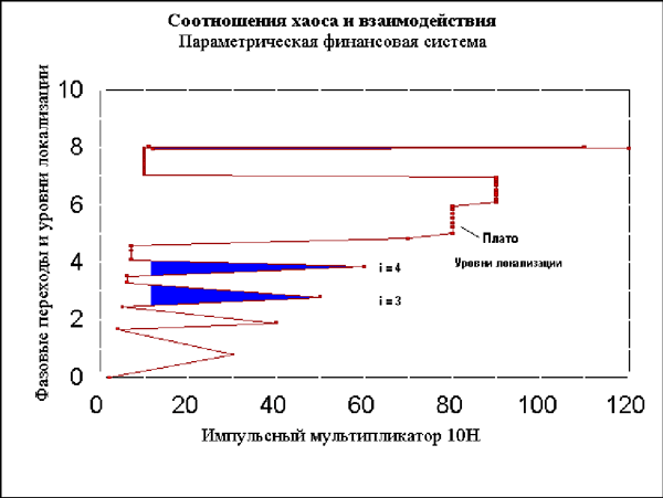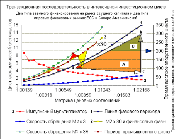 Таким образом, в долгосрочной перспективе в условиях хаоса и взаимодействия длинный промышленный цикл в условиях неомобилизма капиталов окажет влияние не только на объемы, структуру рынков капитала [2], направление ликвидности, товарных потоков на мировых рынках, но и внутриэкономическую сферу. Следовательно, за линией фазового перехода "1" Рис.2, динамика доходности больших ликвидных рынков, противофазное движение иррациональных цен рынка капиталов и общемировой экономический цикл (изломы линии "2" на Рис. 2), являются тем связующим звеном, через который осуществляются прямые и обратные связи локальных и мировых рынков эволюционной сложности современных экономических форм.