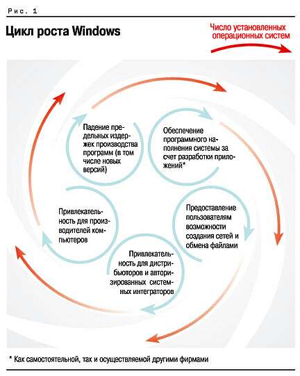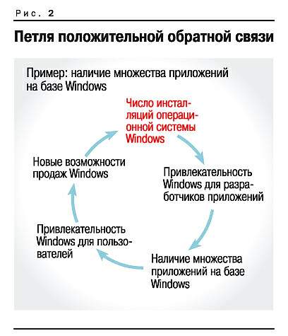 В случае с операционной системой Windows, разработанной корпорацией Microsoft, сразу приходит на ум одна из таких петель. Причина популярности этой системы основана на том, что значительное количество прикладных программ работает под ее управлением. В свою очередь, разработчики этих программ предпочитают создавать их на базе Windows, поскольку количество инсталляций данной системы огромно (свыше 100 млн). Диапазон Windows-приложений широк просто потому, что велико число пользователей Windows.