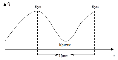 Цикл представляет собой интервал времени в развитии рыночной экономики, в течение которого происходит увеличение объема производства товаров и услуг, а затем сокращение, спад, депрессия, оживление и, наконец, снова его рост (рис. 4).