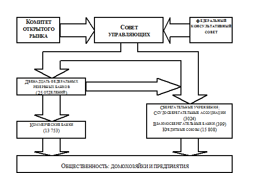 Банковская система США функционирует в узких рамках разного рода административных инструкций и ограничений. С течением времени инструкции, принимаемые на федеральном уровне, приобретали всё возрастающее значение, в то время как роль инструкций, принимаемых и устанавливаемых на уровне штатов, сокращалась. В число важнейших федеральных органов, регулирующих деятельность банковской сферы, входят служба Контролера денежного обращения, Федеральная Резервная Система и Федеральная корпорация по страхованию депозитов. Рассмотрим вопросы структуры и организации банковского дела.