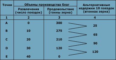 Точка А на кривой производственных возможностей показывает, что все ресурсы общества направлены на производство зерна, и его произведено 300 тонн. Точка Е означает, что в обществе производятся только развлечения (40 поездок к озеру). Это крайние варианты производства. На практике общество выбирает промежуточные варианты, когда производятся и продукты питания, и развлечения. Все возможные объёмы производства на кривой производственных возможностей, в принципе, являются результатом эффективного использования ресурсов.