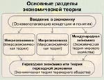 Соответственно в рамках экономической теории выделяются следующие части: введение в экономическую теорию (основополагающие концепции и понятия), микроэкономическая теория, макроэкономическая теория, теория мировой экономики, теория переходной экономики (рисунок 1.8.).