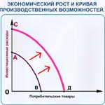На рисунке 7. экономический рост определяется смещением кривой производственных возможностей вправо, то есть от АВ к СД. Рост количества и качества ресурсов и совершенствование технологии обеспечивает возможность такого сдвига, а для его реализации существенны полная занятость и оптимальное распределение ресурсов.