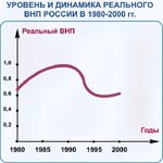 В России экономический рост прекратился в 1990 г., затем начался спад, достигший в 1992-1993 гг. 10-15% в год. Затем спад стад уменьшаться: если в 1994 г. объем производства упад на 13%, то в 1995 г. - на 4%. На рисунке 8. показан уровень и динамика реального ВНП России за 1980-2000 гг. В качестве базисного года использовался 1989 г., в котором ВНП достигал своего максимального значения.
