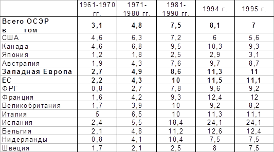 В последние годы на мировом рынке труда сложилась следующая ситуация с безработицей. В странах ОЭСР в конце 1995 г. численность лиц, не имеющих работы, снизилась по сравнению с началом 1994 г. на 0,6%, составив 7,4% экономически активного населения. В основе постепенного сокращения безработицы лежал процесс создания дополнительных рабочих мест, который происходил на фоне умеренных среднегодовых темпов увеличения численности экономически активного населения.