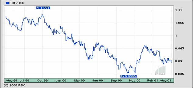 В конце 2000 г. ситуация кардинально изменилась. Замедление темпов роста экономики США, и, наоборот, довольно оптимистические прогнозы о состоянии экономики стран Евросоюза, привели к смене курсовых ориентиров – по мнению большинства аналитиков курс Евро достиг дна и в ближайшие месяцы будет колебаться в диапазоне 0,85-0,95 долларов за Евро с некоторой тенденцией к повышению.