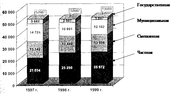 Производственная структура коммунальных предприятий претерпела значительные изменения. Их численность по сравнению с началом 90-х гг. увеличилась в 2 раза, однако главным достижением явилось то, что из 52 тыс. предприятий, работавших на рынке жилищно-коммунальных услуг (ЖКУ), свыше половины (53,9 %) это мелкие предприятия, в основном работающие в жилищной сфере.[5]
