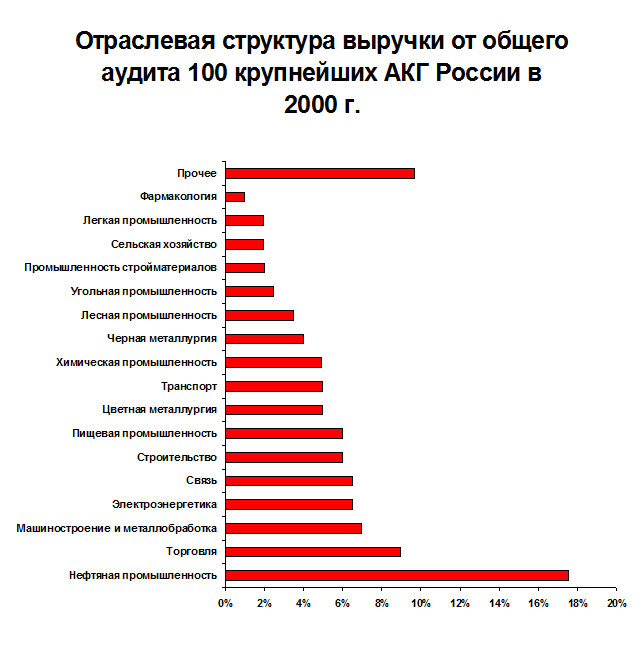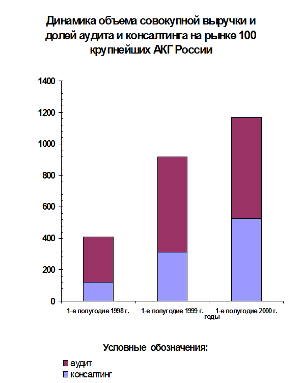 Имеющиеся данные о деятельности крупнейших отечественных аудиторско-консалтинговых фирм свидетельствуют о неуклонном росте их доходов. При этом примерно половина доходов, как уже говорилось, приходится на собственно аудит, а остальная часть – на консультации и другие аудиторские услуги. Однако только за первое полугодие 2000 года объем выручки 100 крупнейших аудиторско-консалтинговых групп (АКГ) вырос по сравнению с первым полугодием 1999 года очень скромно – всего на 27,5%. Такой прирост выручки может быть сравним с увеличением потребительских цен за тот же период (они поднялись примерно на 20%). Однако основные клиенты аудиторов не граждане, а промышленные компании, а их цены выросли на 45%. Если же принять во внимание промышленный подъем, то окажется, что предприятия в первом полугодии 2000 года увеличили свою выручку более чем на 70% по сравнению с аналогичным периодом 1999 года [42, 33].