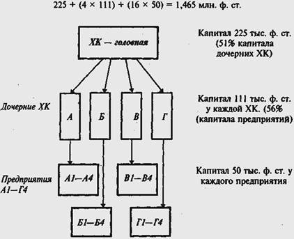 Приведем пример (рис. 5), как холдинговая компания, имеющая капитал в 225 тыс. ф. ст., управляет через четыре дочерние ХК 16 предприятиями с общим капиталом в 1 млн. 465 тыс. ф. ст.