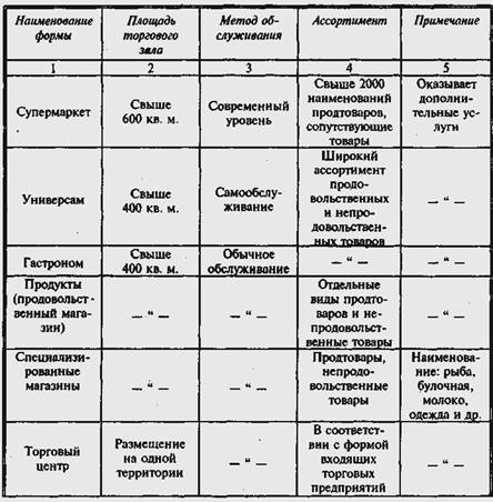 В различных отраслях народного хозяйства существует постоянно пополняемый набор организационных форм. Так, в торговле рекомендуются следующие формы, показанные в табл. 2.