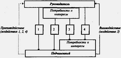 Теория потребностей требует от руководителей осуществлять управленческие отношения только через интересы и потребности (линия 3 на рис. 7), так как другие воздействия (линии 1, 2, 4) приводят к противодействию.