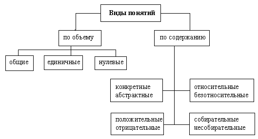 В зависимости от содержания и объема все поня тия делятся на конкретные виды. Для наглядности представим их в виде схемы, а затем последовательно рассмотрим каждый вид более подробно. Единичными называются понятия, в которых мыслится один предмет (например, "великий русский писатель Александр Николаевич Островский", "Организация Объединенных Наций", "столица России" и другие).