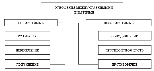 Если понятия не имеют общих признаков, далеки друг от друга по своему со держанию, то они называются несравнимыми (например, "симфоническая музыка" и "солнечное затмение", "воздушное пространство" и "библиотека"). Сравнимыми называются понятия, имеющие общие признаки (например, "язык" и "иностранный язык", "экономист" и "работник банка"). Сравнимые понятия делятся по объему на совместимые и несовместимые.