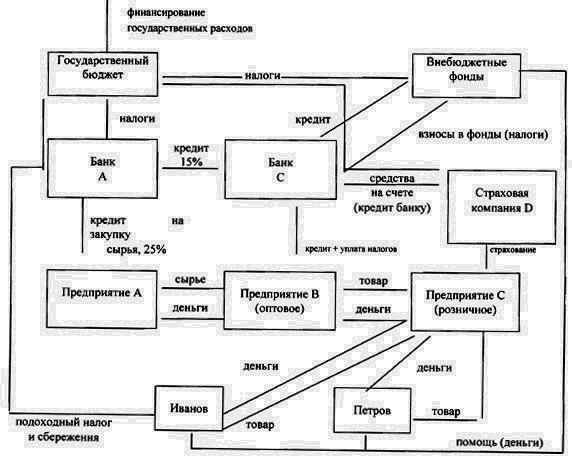 Представим себе рассматривавшуюся выше ситуацию с точки зрения всех звеньев финансовой системы. Предприятие А торгует с предприятиями В и С, товары продаются Иванову и Петрову, происходит страхование у компании D, уплачиваются налоги и т.д. Более того, на приведенном примере можно увидеть элементы того, как финансовая система взаимодействует с денежно-кредитной.