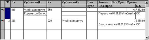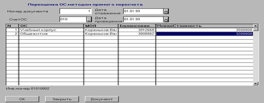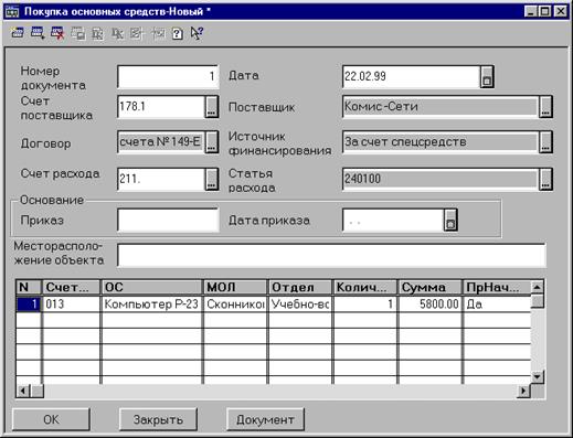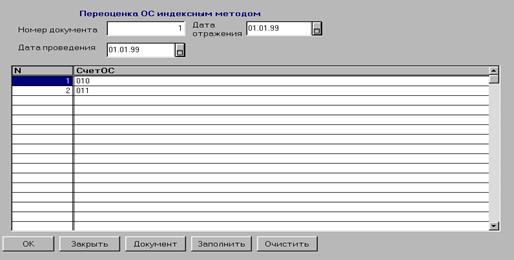 После заполнения последней графы таблицы на экран вновь будет выдан список основных средств для очередного выбора. Таким образом заполняются строки табличной части документа.