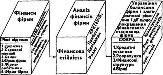 Фінансами фірми називаються будь-які складні економічні відносини, які виникають з приводу формування і розподілу грошових коштів для забезпечення збалансування доходів і витрат, фінансової стійкості і платоспроможності фірми за критерієм одержання прибутків і одночасної підтримки благополуччя акціонерів на різних рівнях відносин: з державою - з приводу платежів і отримання бюджетних асигнувань; зі страховими компаніями - по страхових внесках і страхуванню ризиків та майна; з інвестиційними інститутами: інвестиційними фондами, холдингами, консорціумами — з приводу підтримки інноваційних програм та інвестицій; з банками - з приводу кредитів, сплати позичкових процентів і депозитів; на власній фірмі - з приводу продажу акцій і забезпечення дивідендів акціонерам.