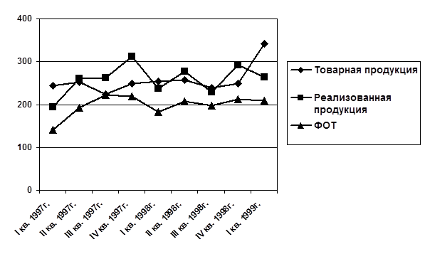 Анализ корреляции между рядами динамики выпуска и оплаты труда сотрудников показал, что корреляция между объемом товарной продукции и ФОТ составляет всего 0,11. Столь малая зависимость между этими показателями свидетельствует о том, что формирование фонда оплаты труда сотрудников происходит не на основании объема произведенной продукции, т.е. сдельная система оплаты труда на предприятии не нашла широкого применения. Коэффициент корреляции между реализованной продукцией и ФОТ оказался равен 0,89. Это показатель достаточно тесной связи, что свидетельствует о том, что оплата труда сотрудников предприятия сильно зависит от поступления оплаты произведенной продукции заказчиками.