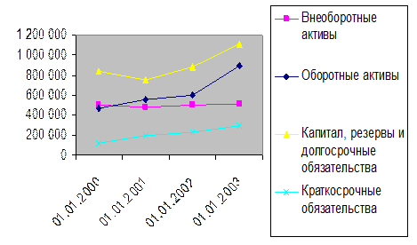 Анализируя таблицу 1 в активах можно увидеть тенденцию постепенного сокращения доли внеоборотных активов и увеличение доли оборотных средств. Если на начало 2000 года они были примерно равны (52% и 48%), то в конце 2002 года оборотные активы явно превалируют – всего 36% внеоборотных против 64% оборотных активов. Эти изменения произошли за счет более быстрого постоянного роста оборотных средств – на 93% (896027/464000 * 100% - 100%) за три года по сравнению с 2% ростом ( 511367/499000*100%-100%) внеоборотных активов за тот же период.