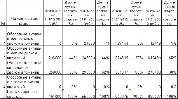 В 2002 году (на 01.01.2003 г.) доля оборотных активов с минимальным риском вложений уменьшилась на 4% до 1%, повторяя движение доли наиболее ликвидных активов.