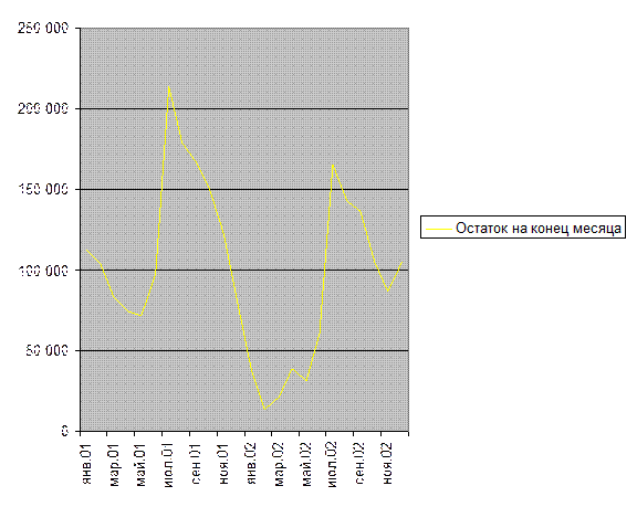 Резкими скачками отмечен 2001 год. Величина запаса на конец марта 2001 года возросла в 2,3 раза. Причина – 50-типроцентное превышение производства продукции над сбытом. И это при том, что в течение двух предыдущих месяцев производство равнялось сбыту. В марте же производство было увеличено на 31,6% по сравнению с февралем, а сбыт упал на 14%.