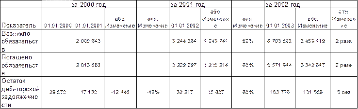 К концу 2002 года резко вырос остаток задолженности – в 5 раз, а ткже объем реализации за год и объем исполнения дебиторами своих обязательств – в 2 раза.