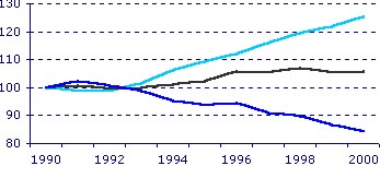 В 1999 в экономике Великобритании продолжался подъем - один из самых длительных за послевоенный период. Однако его интенсивность в первом полугодии снизилась. В то же время в стране не произошло ожидавшейся в 1998 году рецессии. Более того, к концу года экономическое развитие вновь ускорилось. Быстрее, чем экономика в целом, развивалась сфера услуг. Значительную роль в экономическои развитии играли потребительские расходы, прежде всего на товары длительного использования. Важнейшим фактором роста было увеличение занятости и падение уровня безработицы, увеличение реальных доходов населения. Внутренний спрос стимулировался высоким курсом фунта. О целях и стратегиях развития экономики Великобритании автор пишет так: правительство намерено усилить позиции Великобритании в мировой и европейской экономике.
