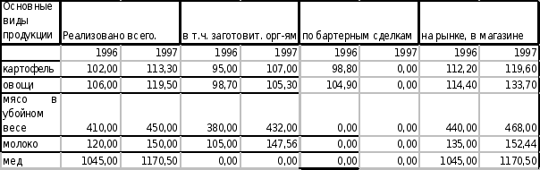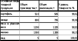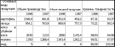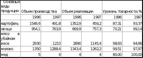 Основными показателями деятельности предприятия является объем производства и реализации продукции. Производство продукции характеризуется в валовой и товарной формах. Валовый сбор картофеля за 1997 год составляет 491,8 т., овощей 763,9 т., в том числе уровень товарности по картофелю – 93,4 %, по овощам – 99,14 % (Данные приведены в Таблице 1).