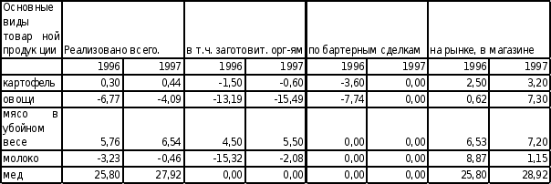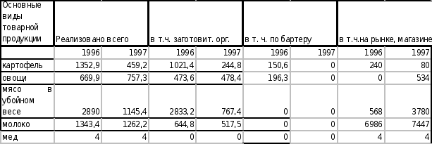 В 1997 году по сравнению с 1996 на сократилось поголовье коров (с 340 до 322), снизились удои на 1 корову. В основном это объясняется нехваткой кормов, из-за сложного финансового положения. Также снизились объемы реализации картофеля, мяса и молока. Снижение объема реализации картофеля объясняется неурожаем 1997 года. (Объем производства снизился более чем в три раза).