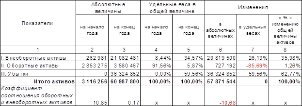 Анализ структуры активов проведем на основе данных табл. 2.1. В таблице представлены абсолютные величины по видам активов, их удельные веса в общей величине активов, изменения абсолютных величин и удельных весов, значения и изменения коэффициента соотношения оборотных и внеоборотных активов за отчетный период. В графе 8 таблицы отражены доли изменений по каждому виду активов (внеоборотные, оборотные) в изменении общей величины активов предприятия. В ходе анализа информации поданной графе выясняется вид имущества, на увеличение которого в наибольшей мере был направлен прирост источников средств организации.