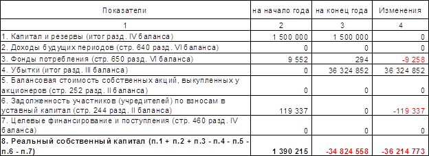 На начало года разница составила: 1 390 215 - 1 500 000 = -109 785; а на конец года -34 824 558 - 1 500 000 = -36 324 558. Очевидна недостаточность реального собственного капитала.