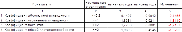 На конец отчетного периода все коэффициенты ликвидности и платежеспособности имеют значения значительно ниже допустимых, что однозначно свидетельствует о глубоком кризисном состоянии предприятия и является основанием для признания его неплатежеспособным.