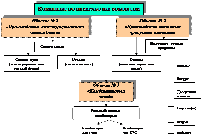 Объект 3 «Комбикормовый завод» основан на использовании в качестве сырья отходов объекта 1 (соевую шелуху) и объекта 2 (окару) для производства высококачественных белковых комбинированных смесей для развития и поддержания жизнеспособности животноводческих и птицеводческих агрокомплексов Сибири и Казахстана.