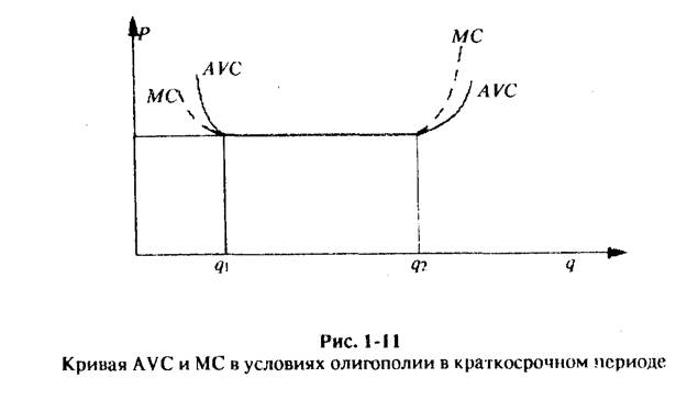 Способность удерживать цены в краткосрочном периоде заложена в самой структуре фирм-олигополистов: планируя производство, они заранее подготавливают его к возможным падениям или увеличениям спроса. Обычно фирма-олигополист имеет своеобразную кривую средних переменных издержек (рис. 1-11). При такой кривой A VC выпуск товара с величины q1 до q2 может производиться при одном и том же уровне переменных издержек. На этом интервале предельные издержки также не меняются и равны средним переменным.