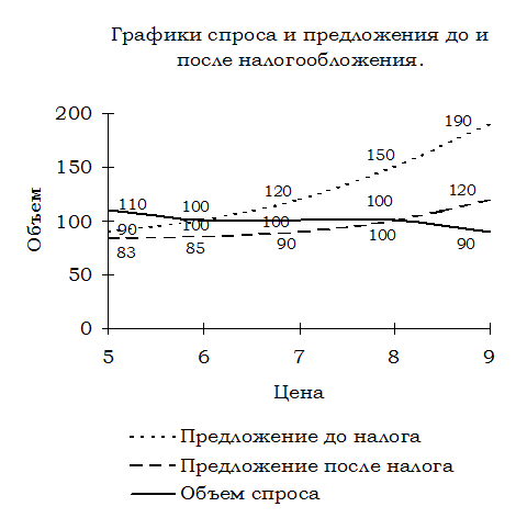 Принимая во внимание то, как изменится объем предложения при введении налога, и сравнив снова, с этой поправкой, таблицы, видно, что равновесная цена будет равна 8 тыс. р. при равновесном объеме 100 тыс. шт.