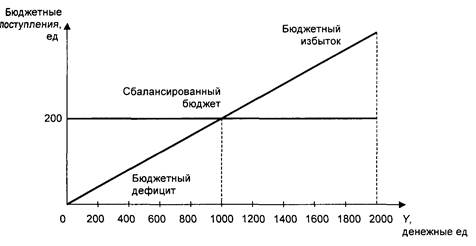 Предположим, что государственные расходы составляют 200 денежных ед , а налоговая ставка / = 0,2. Следовательно, при Т = 0 налоговые поступления Т = 0. Когда доходы возрастают до 1000 ед, то налоговые поступления равны государственным расходам (200 ед ) При доходах 1500 ед государственные расходы составят 300 ед и т д Таким образом, при низком уровне доходов возникает дефицит государственного бюджета, при высоком — избыток бюджета
