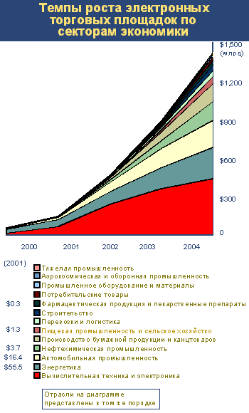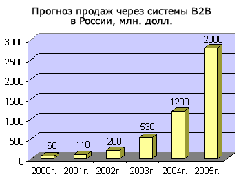 Это принято называть "электронной коммерцией", которая является основной составляющей, частью Интернет-экономики в целом. "Электронная коммерция", высвечивающая на экране мониторов спрос и предложение, развивается быстрыми темпами, но это ничто по сравнению со скоростью и абсолютными показателями межфирменной торговли товарами через "Интернет". По некоторым оценкам электронная торговля "бизнес-потребитель" вырастет с $8 млрд. до $108 млрд. в 2003 году. В то же время электронная торговля в отношениях "бизнес-бизнес" вырастет за тот же период с $43 млрд. до $1,3 триллионов. Этот оборот совместим с ВВП таких стран как Франция, Германия, Италия, Великобритания. А ВВП России составляет лишь 1/6 часть. Европа войдет в стадию "гиперроста" электронной торговли через 2-3 года, а Япония, Италия и Франция - через 4-5 лет. Данный пример приведен, в первую очередь, для соизмеримости величины оборота электронной торговли и производства ВВП.