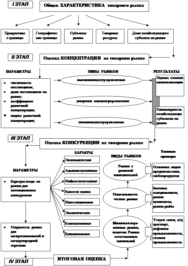 Методический подход к изучению конкурентной среды сводится к всесторонней характеристике предмета — товарного рынка — на I этапе, подробному анализу и оценке структуры различных видов товарных рынков, характеризуемых на II этапе количественными параметрами процессов концентрации и качественными показателями конкуренции — на III этапе оценки. Общая логика проводимой в несколько этапов аналитическо-расчетной работы представлена на схеме №1.