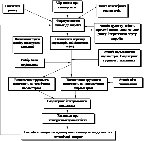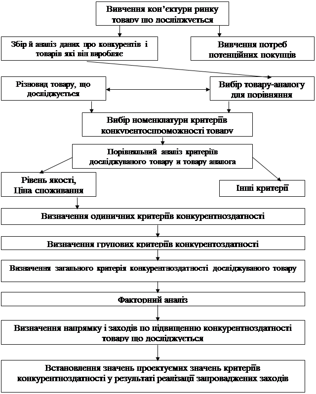 Щоб оцінити конкурентноздатність товару, необхідно вирішити широке коло питань і насамперед одержати об'єктивну інформацію про ті ринки, де вже реалізується чи пропонується збувати товар, про його конкурентів. Аналізу ринків приділяється основна увага. Особливо це відноситься до оцінки тих потреб, що передбачуваний товар не задовольняє, до виявлення негативних і позитивних властивостей цього товару, що відзначають споживачі. На закінчення зважується питання, чи відповідає в даний момент вироблена продукція по технічному рівні і якості вимогам кінцевих споживачів, і оцінюється конкурентноздатність її в результаті комплексного дослідження ринку.