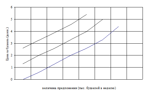 Легко заметить что таблица 2 показывает положительную, или прямую связь между ценой количеством предлагаемого продукта. С повышением цен соответственно возрастает и величина предложения; со снижением цен сокращается также и предложение. Эта специфическая связь называется законом предложения. Он просто показывает, что производители хотят изготовить и предложить к продаже большее количество своего продукта по высокой цене, чем они хотели бы это делать по низкой цене. Почему? Это в основном также диктуется здравым смыслом.