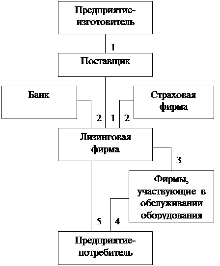 В период трансформации украинской экономики от плановой к смешанной появляется интерес к новым нетрадиционным формам деятельности предприятий. Одной из таких форм является лизинг. Закон Украины о лизинге определяет: «Лизинг – это предпринимательская деятельность, направленная на инвестирование собственных или привлеченных финансовых средств и заключающаяся в предоставлении лизингодателем в исключительное пользование на определенный срок лизингополучателю имущества, которое является собственностью лизингодателя или приобретается им в собственность по поручению и согласованию с лизингополучателем у соответствующего продавца имущества, при условии уплаты лизингополучателем периодических лизинговых платежей » (1,с.7). Анализ современного состояния парка оборудования большинства предприятий и перспективы развития рынка отечественной конкурентоспособной продукции позволяет выдвинуть тезис о целесообразности развития лизинга. Думается, что в сложившихся условиях, когда предприятия потребители, оборудование которых является устаревшим и требует замены, не имеют достаточных ресурсов для того, чтобы купить сложную новую технику для выпуска конкурентоспособной продукции, а предприятия-изготовители испытывают серьезные трудности сбыта своей продукции – использование лизинга могло бы существенно способствовать смягчению ряда противоречий. Ряд специалистов-хозяйственников считают, что лизинг – единственное средство расширить платежеспособный спрос на отечественном рынке, оживить экономику (4). Из чего следует, что лизинговой компании следует работать в паре с банком. Достаточным свидетельством такого удачного содружества в отечественных условиях может служить «Лизинговый дом», являющийся дочерней компанией банка «Украина». Более того, необходимо появление еще одного участника процесса, а именно – страховой компании, специализирующейся на страховании лизинговых сделок. В случае со связкой «Лизинговый дом» – банк «Украина» риск к минимуму сводит АСК «Энергополис». Эта компания не только готова в случае непредвиденной ситуации возместить лизингодателю стоимость оборудования, но также страхует жизнь и здоровье лизингополучателя и работающих у него людей на время заключения сделки. Далее приведем условные схемы (рис.1,2,3) организации лизинговых операций, использование которых в настоящее время по нашему мнению перспективно в Украине.