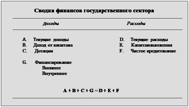 По определению, сумма всех бюджетных поступлений должна равняться сумме всех видов расходов. Следовательно, как и в отношении платежного баланса, понятие сальдо бюджета включает выделение, в целях анализа, подсистемы бюджетных операций в целом. В схеме 1 дается сводка основных составляющих бюджетного отчета.