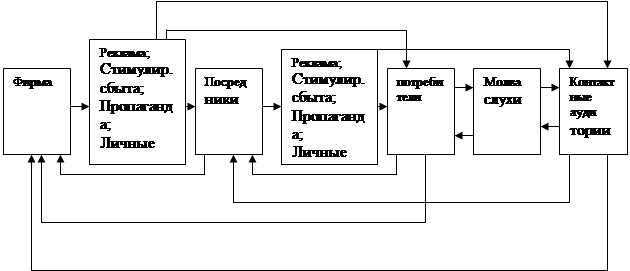 Сама она поддерживает коммуникации со своими посредниками, потребителями и различными контактными аудиториями. Ее посредники поддерживают коммуникации со своими потребителями и различными контактными аудиториями. Потребители занимаются устной коммуникацией в виде молвы и слухов друг с другом и с другими контактными аудиториями. И одновременно каждая группа поддерживает коммуникационную обратную связь со всеми остальными.