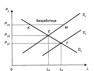 Соединив графики спроса и предложения, получим неоклассическую модель рынка труда, показывающую, что все желающие работать могут найти работу при сложившейся равновесной ставке заработной платы Р LE . Если предложение труда возрастает (сдвиг кривойS L в положениеS’ L ), то это приводит к снижению заработной платы до Р LF и равновесие на рынкетруда устанавливается в точкеF.