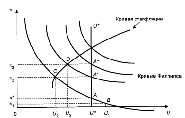 Своими действиями государство провоцирует не только рост цен, но и повышение безработицы. Кривая, проходящая через точки С, D является кривой стагфляции.