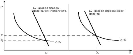 Фирмы-олигополисты, зная, что появление нового конкурента уменьшит их долю рынка, попробуют не допустить этого, воспользовавшись своими преимуществами. Они установят цену ниже Рн , но в силу экономии от масштабов производства и в этом случае (между Рн и Ро ) будут получать прибыль. Новая же фирма понесет значительные потери и вынуждена будет уйти с рынка (при ценах ниже Рн кривая спроса Dн лежит ниже АТС, и, следовательно, новая фирма не может покрыть своих издержек).