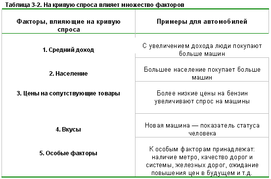 • И наконец, спрос на отдельные товары зависит от особых факторов -ливни повышают спрос на зонты, снегопады помогают продавать лыжи, а прибрежные волны оказывают влияние на спрос на серфингборды. Более того, ожидания определенной экономической обстановки (конъюнктуры) в будущем, особенно ожидания цен, могут оказывать большое воздействие на спрос. Факторы спроса представлены в табл. 2.