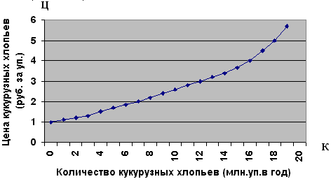 Табл. 3 иллюстрирует гипотетическую шкалу предложения для кукурузных хлопьев, а рис. 3 представляет данные из таблицы в виде кривой предложения. Эти данные говорят о том, что при цене в 1 руб. за упаковку кукурузных хлопьев, их не будет произведено совсем. По такой низкой цене производители продуктов для завтрака из злаковых, вероятно, захотят перевести свои предприятия на производство других продуктов, таких как отруби, - более выгодных, чем кукурузные хлопья. С возрастанием цены на кукурузные хлопья, будет все больше увеличиваться их производство. При самых высоких ценах на кукурузные хлопья, изготовители продуктов из злаковых сочтут выгодным подключить к работе больше рабочих, оборудования для производства и упаковки хлопьев в коробки, и даже вовлечь больше фабрик в их производство. Все это приведет к увеличению выпуска кукурузных хлопьев по более высоким рыночным ценам